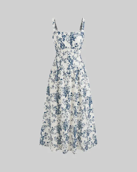 Our Square Neck Floral Corset Lace Up Midi Dress combines traditional charm with modern styling. This flowy midi dress features a delicate blue floral pattern on a crisp white background, offering a refreshing aesthetic suitable for various settings.